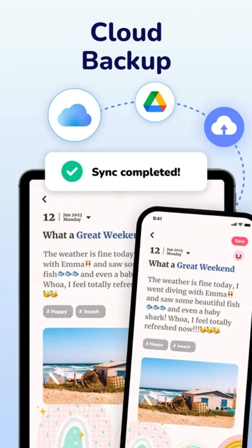 Secure your precious memories! With our Cloud backup, your diary data is securely stored and always ready for you. You can easily switch devices without the risk of losing your diary.