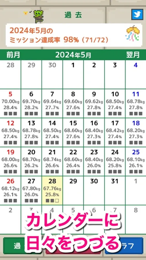 毎日気づいたことなどをカレンダーにメモできます。自分に合った、痩せる習慣を見つけよう。