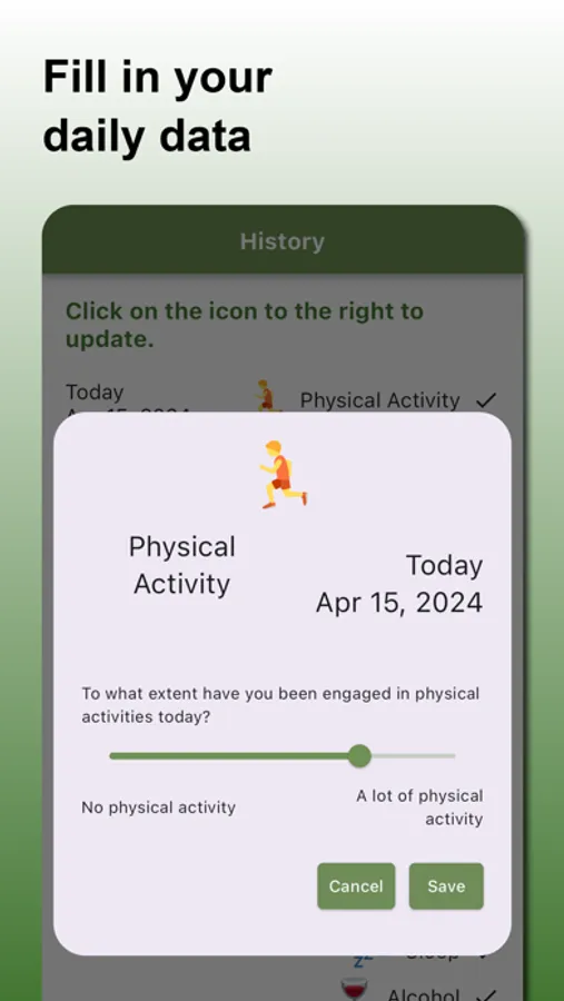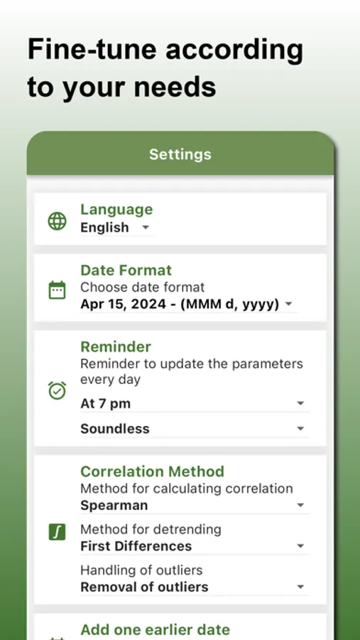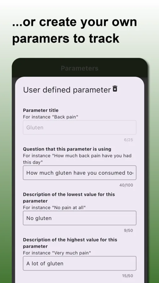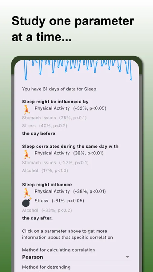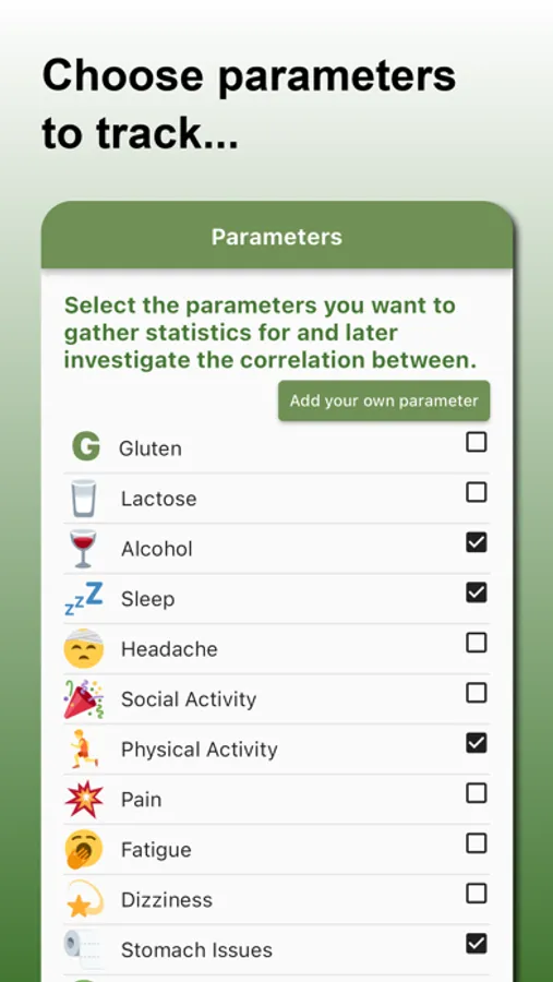 Correlation Finder offers a variety of predefined parameters that you can track daily, including sleep quality, exercise, dietary habits, and much more. Additionally, you can create and define your own custom parameters to tailor the app to exactly what you're interested in.