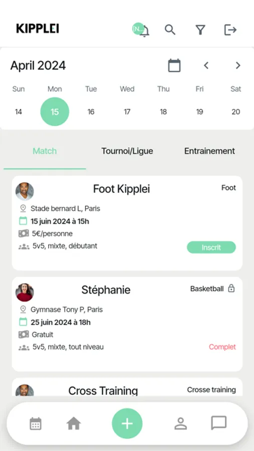 Recherche intuitive : Choisis ton sport, ta date, ton niveau, ton lieu et ton genre, et Kipplei te propose des matchs qui te correspondent parfaitement.
