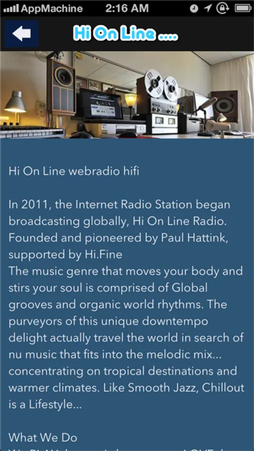 Hi On Line is an internet radio station for Hi-End Audio. All the music is playing in realtime, no loudness or equalisation. The sound is pure. Also in realtime, high speed, 2 track taperecorders will be used, 2 microphones recordings will be demonstrated on Revox A-77 tape recorder.
