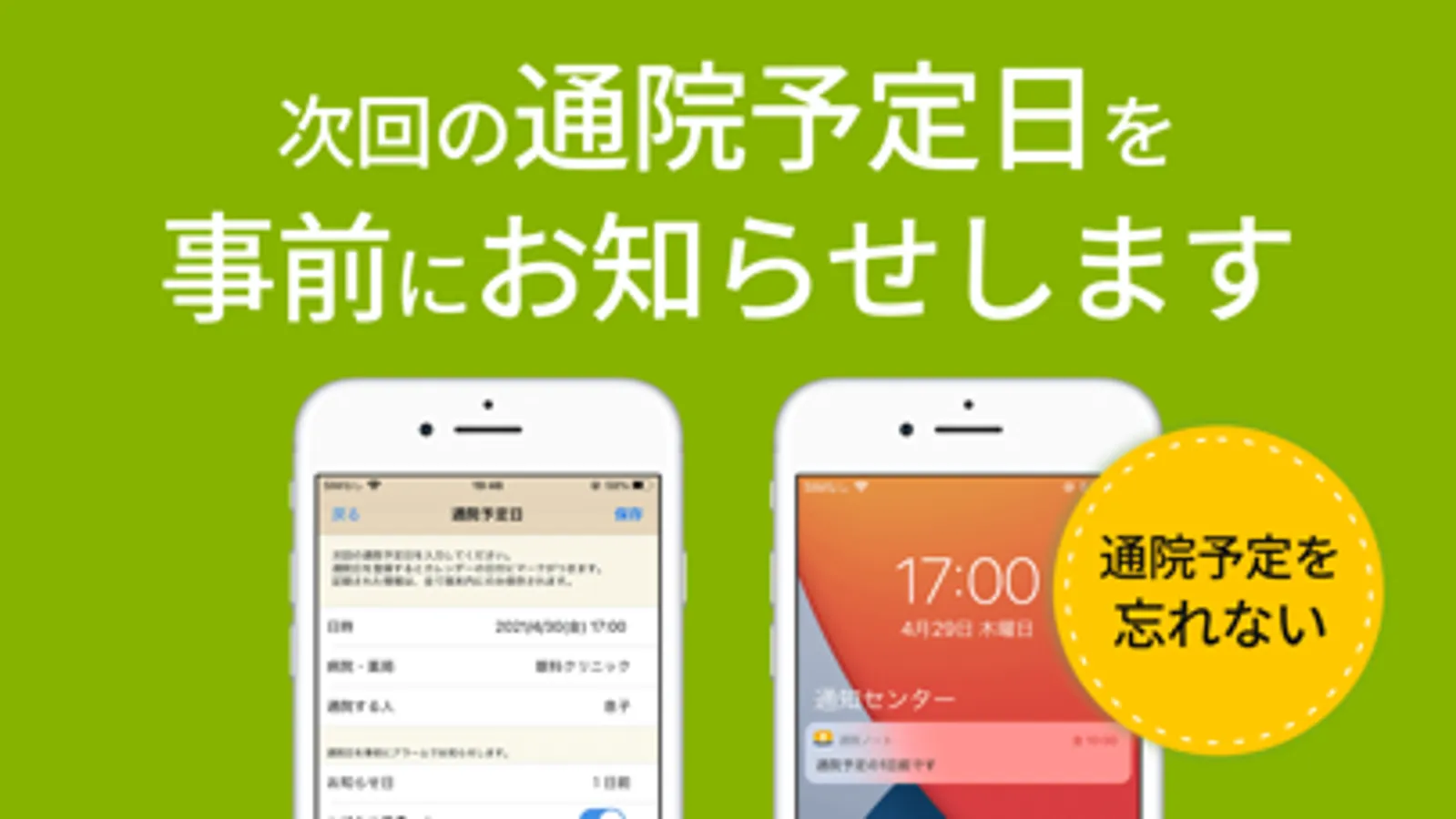 通院日が近付くとリマインドを受け取れますので、定期的な通院だけでなく検査や検診、健康診断や人間ドックなどの先々の通院予定も予約しておきましょう!