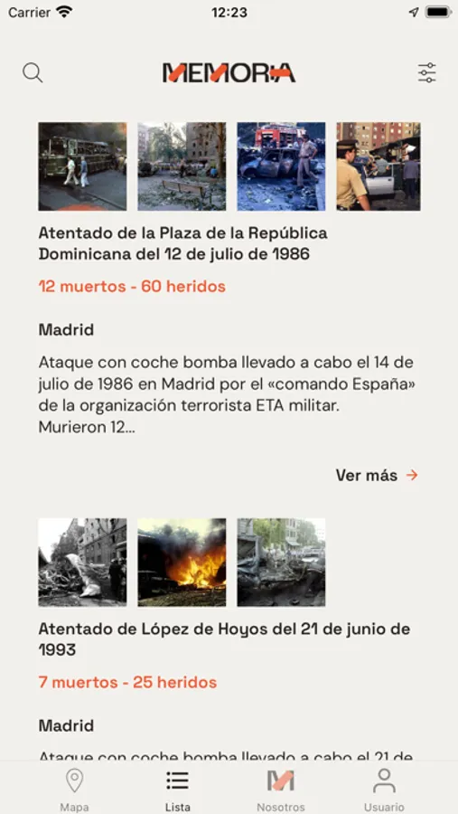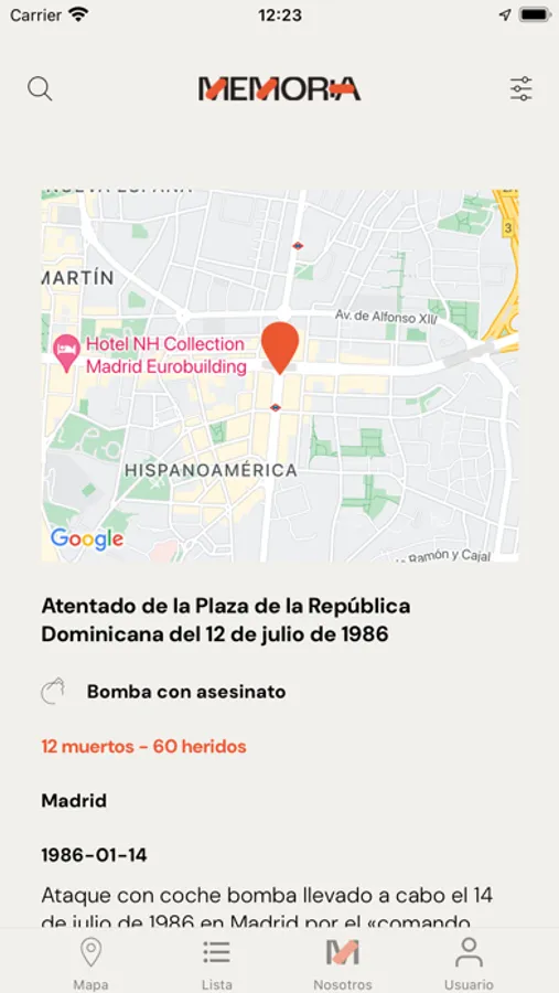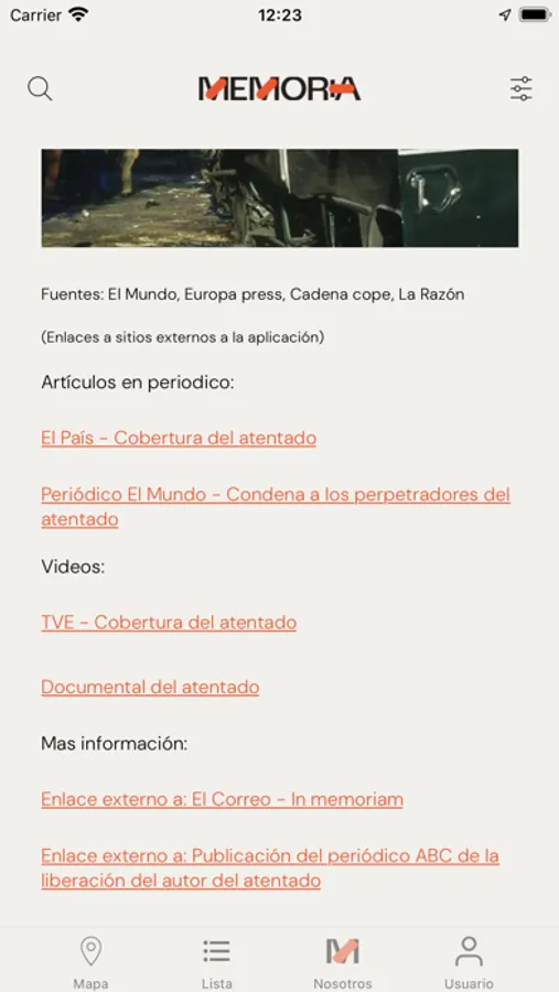 Esta aplicación sitúa los atentados de ETA en el mapa de España: cada atentado contiene su ubicación y una explicación de lo ocurrido, que incluye vídeos y noticias, evitando así su olvido o el intento de reescribir la historia.