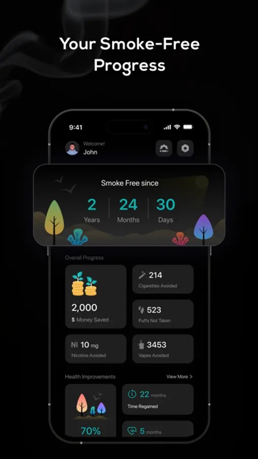 NoPuff’s personalized dashboard shows you your Smoke-free time, money saved, health restored, nicotine avoided, cigarettes & vapes avoided, puff count, time saved, etc! Whether you want to save money, have stronger lungs, or live a quality life, NoPuff has your back!
