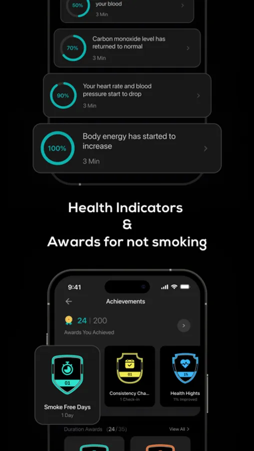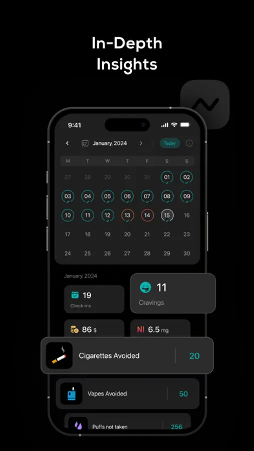 ‣ Daily Check-ins: Did you have a smoke-free day? Great! Check in daily to create a streak that keeps you motivated for the future.