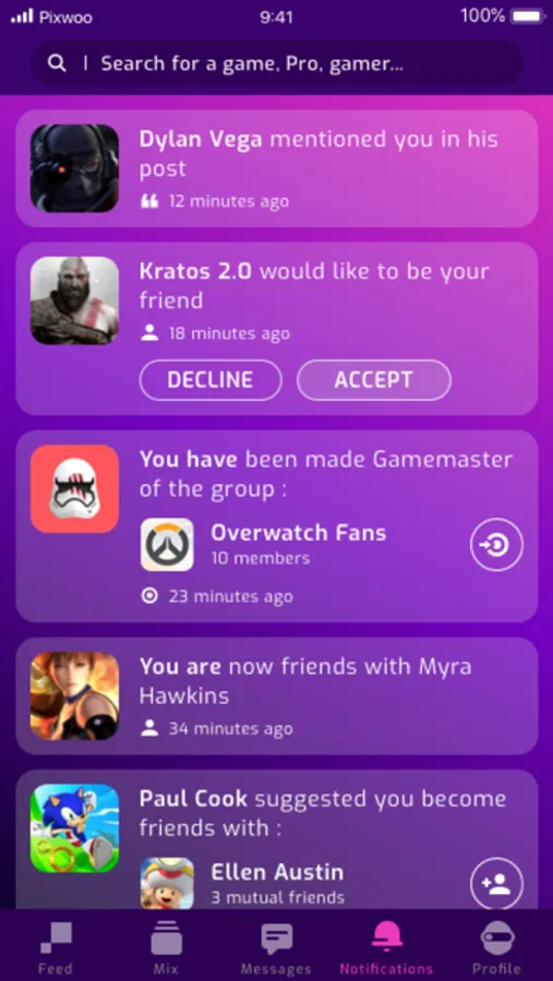 Pixwoo alerts you when a Youtuber or Pro gamer you follow posts information or exclusive videos. You'll also be notified in real time when you have a friend request, suggestion from your network or when a member mentions you in a post.