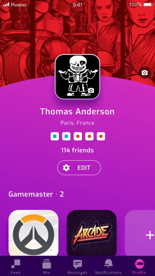 Fill in your player profile with your favorite games, your consoles and your gamertags to get your Pixwoo DNA. This will allow you to easily meet similar Pixwoo members and develop your very own Gamer network.