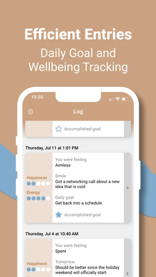 - Over time, you'll see your entries fill up your timeline - you'll easily be able to review your old entries and add self-reflection comments as you look back on the older entries with the perspective of hindsight.