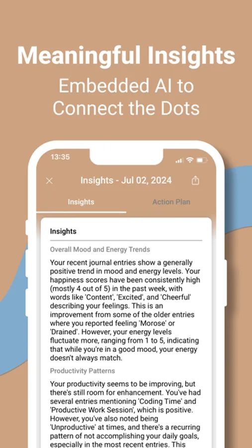 - Each week, embedded AI can anonymously analyze your entries, self-reflection comments, trends, and patterns to provide you with an easy-to-read report of insights into your recent productivity and wellbeing and clear action steps you can take over the next week to try to improve