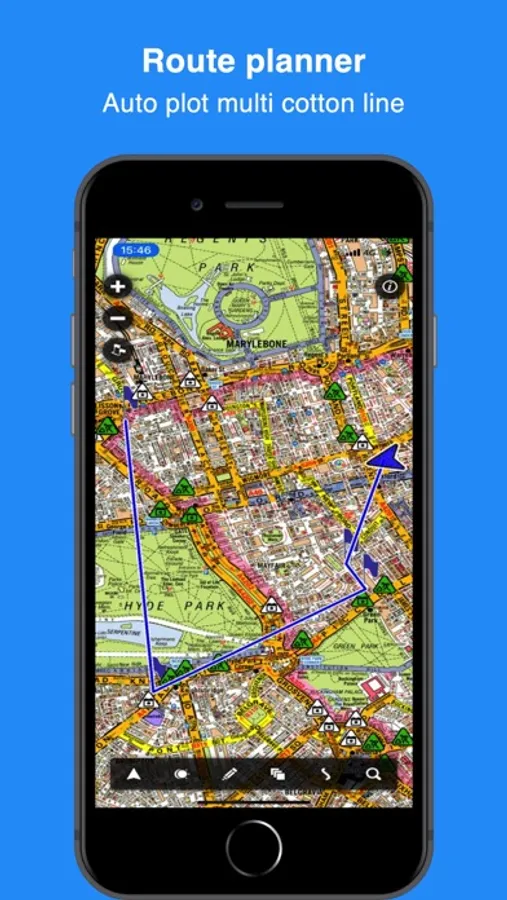 Your current position is clearly displayed on the map when connected to GPS. Having selected a destination, our A-Z app automatically draws a straight, as the crow flies, blue 'cotton line' from your current position to the chosen destination to facilitate route planning. Additionally, you can select an alternative start point on the map by pressing down by finger; the app will draw the 'cotton line' from there to your chosen destination.