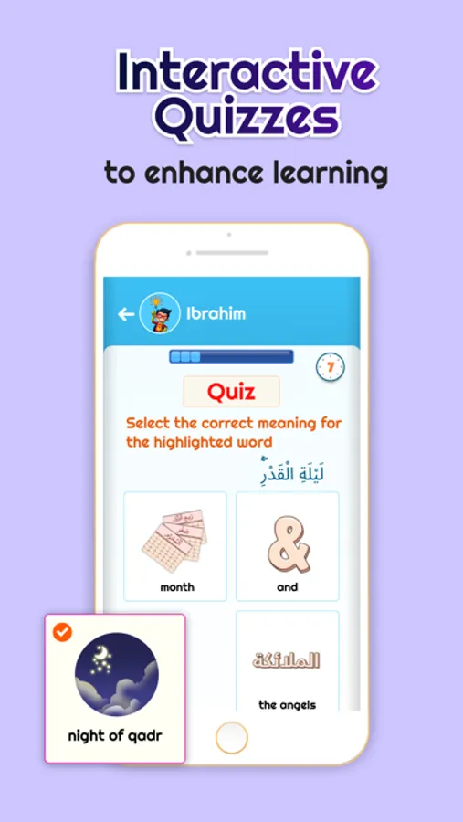Quiz Yourself: Our app features a self-learning quiz format that encourages children to actively participate in their Quran learning journey. Through these quizzes, kids can match words with their corresponding images, strengthening their grasp of Arabic vocabulary within the context of the Quran while enjoying the process.