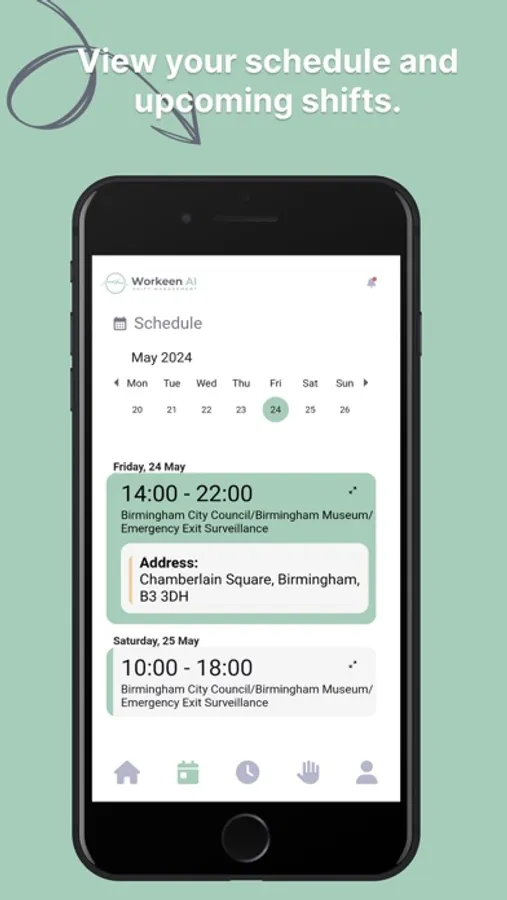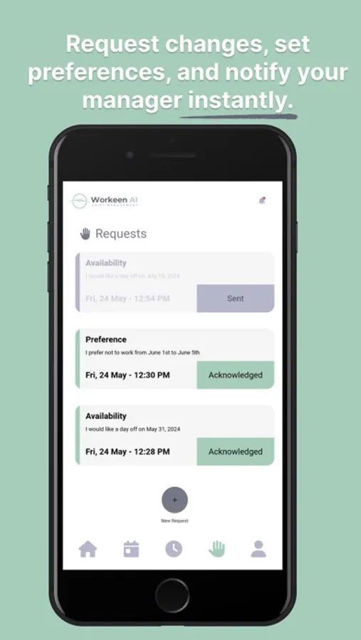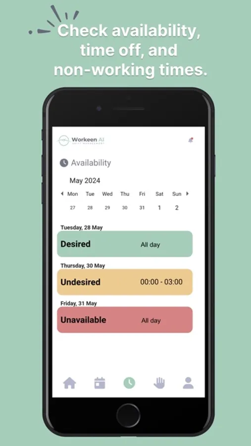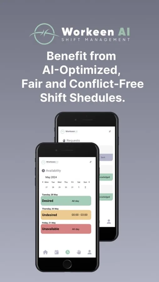 Workeen AI: Your ultimate shift companion. Stay organized, effortlessly request changes to your shift directly to your manager, set your availability, and easily check when and where you work. Take control of your schedule and manage your time with efficiency and ease.