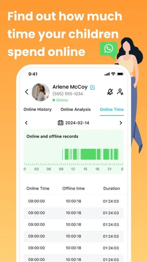 -You can record the concrete time when someone is online/offline on WhatsApp. You can check the online time log anytime.