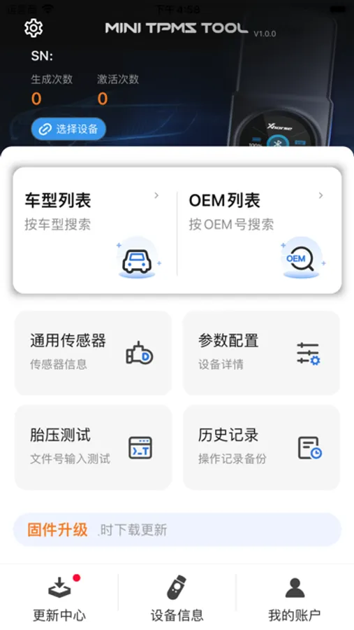 The main functions of MINI TPMS TOOL include entering the tire pressure related function menu, general sensor, parameter configuration, tire pressure test, history, update center, device information, my account, etc. by searching by model or by OEM. You can also view the device serial number, power, generation, and activation times.