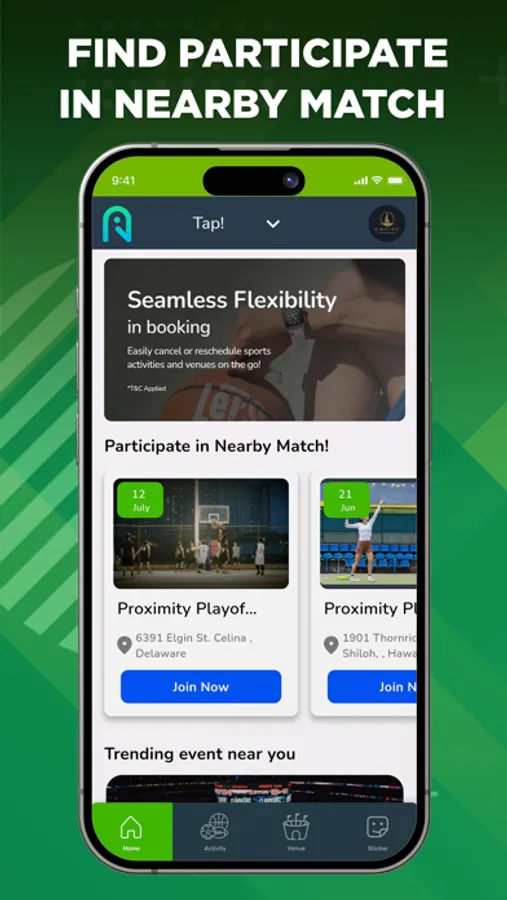 Simply select your preferred sport, and the app will provide a list of available venues and upcoming games within your vicinity. You can sign up to participate, and check games in the venue.