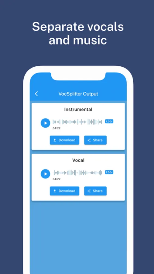 Once you're satisfied with your splitting, VocSplitter makes it easy to download or share your converted file with the world. You can download both vocals and instruments from the original file and save it on your device. There is also a one-click solution that allows you to share the files.