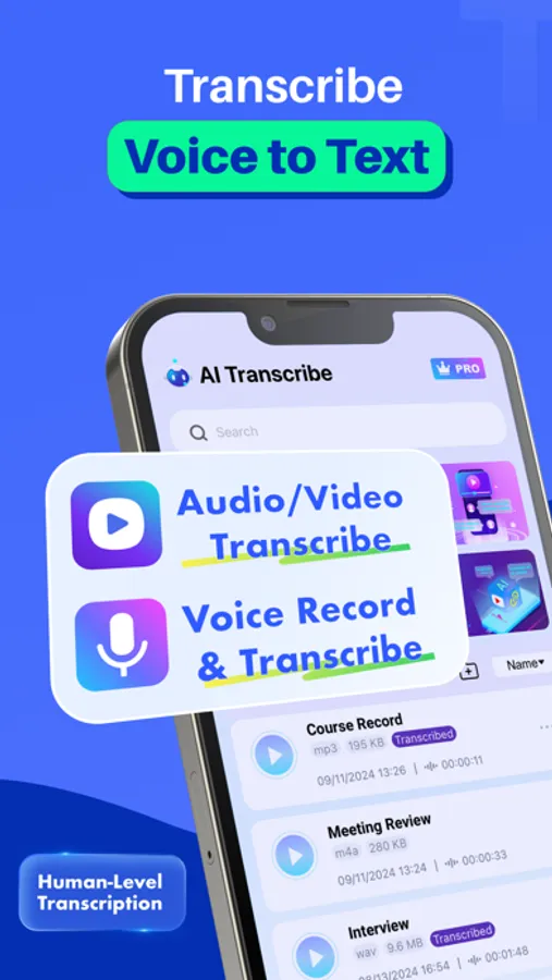 Upload files from your phone, cloud drives, or voice memos. Supports common formats like MP3, M4A, WAV, and more.