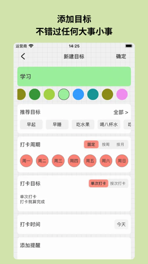 大大的梦想也需要分解成每一个小目标的努力,简单打卡,提前规划好每天事项,只需要轻轻松松按下习惯,您的打卡就完成了。