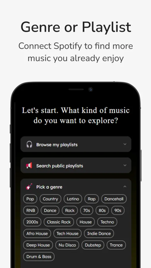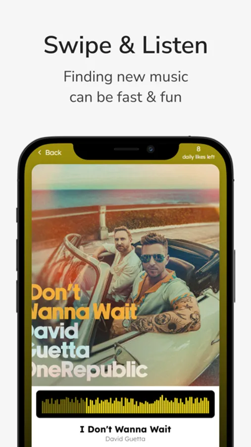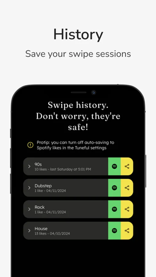 Sync with Spotify and every song you like is automatically saved to your Spotify likes. Save entire swipe sessions as playlists and take your music anywhere.