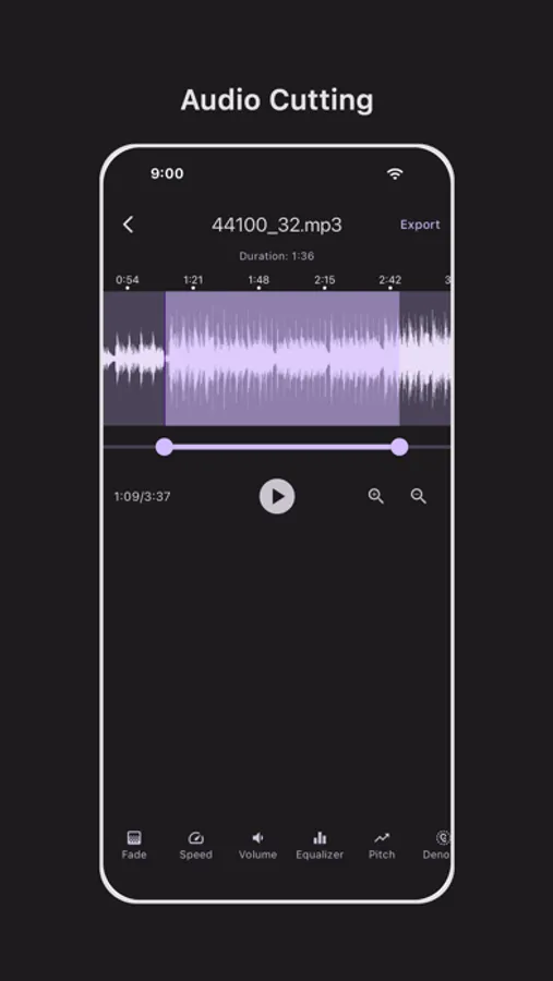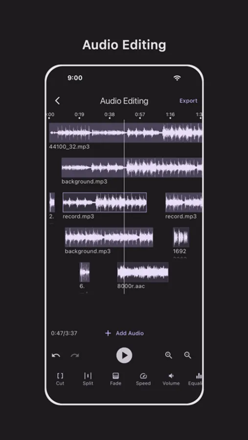 Audio Editing: Mix and splice multiple audio files, supporting splitting, cutting, adjusting playback speed, fade in/out, noise reduction, equalizer, modifying pitch, and adjusting volume.