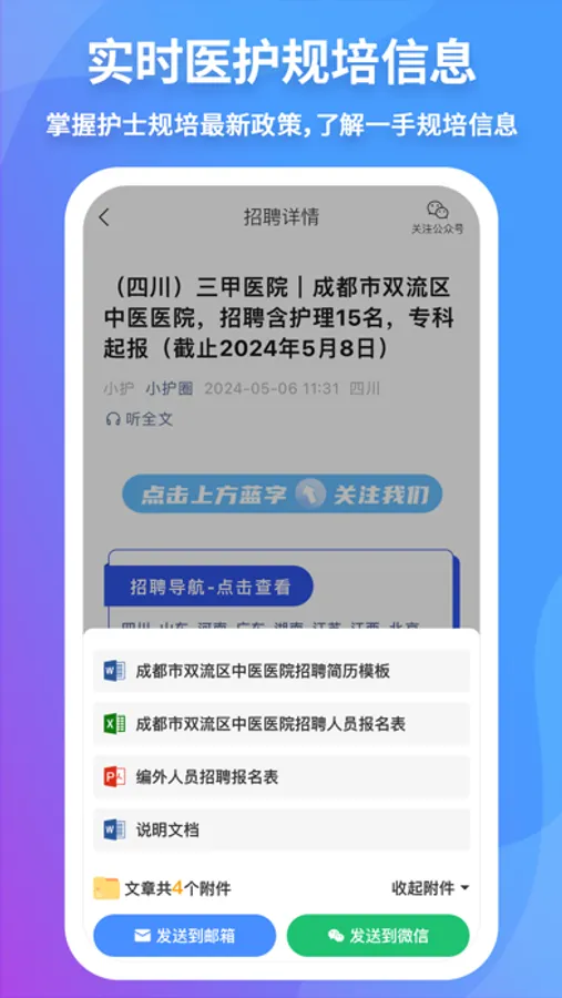 小护圈专注于为医护人才找工作,为您提供全国主要城市公立、民营医院招聘信息,卫生事业编制,提供最新最全的护士招聘、规培信息,每天更新医院招聘信息,医生、护士找工作就上小护圈,更省力!专业的医护找工作软件。为中专,大专,本科,研究生等学历护士人才提供高效快捷的医院求职招聘服务。