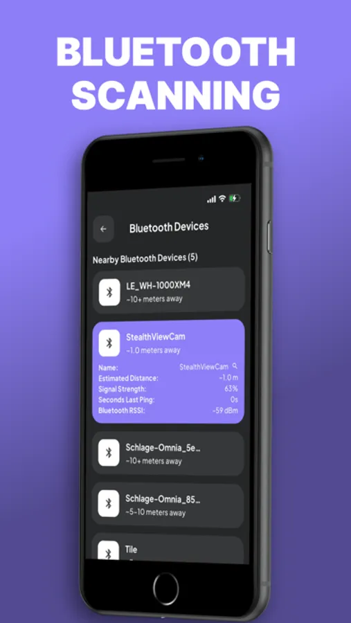 Use SweepScan's advanced Bluetooth device scanner to scan for ALL nearby Bluetooth devices. SweepScan's Bluetooth Scanner estimates the distance between devices and helps you quickly find and assess any potential hidden cameras.