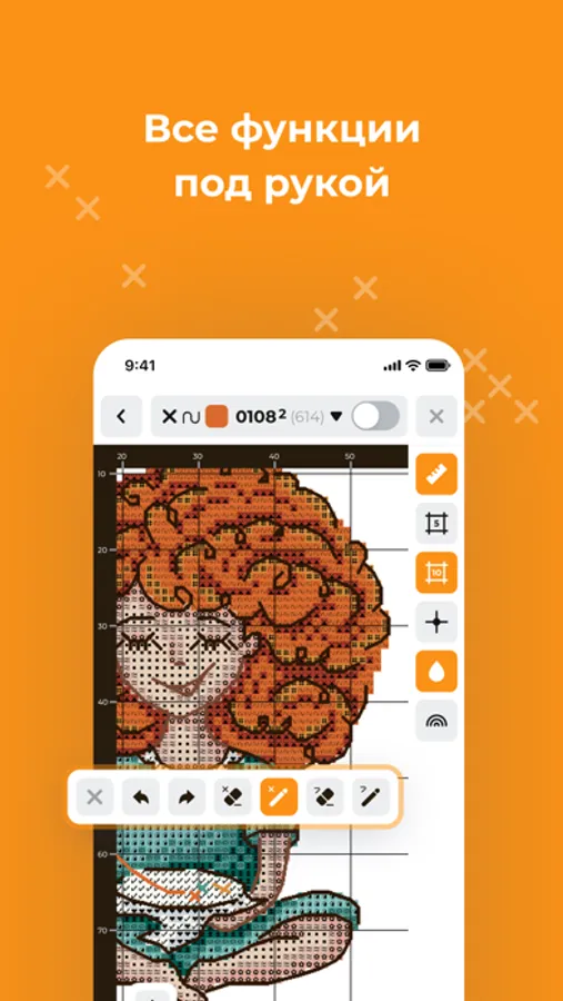 Интерактивные инструменты существенно облегчают процесс взаимодействия со схемой. Линейка, сетка 1х1, 5х5 и 10х10, центровка а также выделение и изоляция выбранного цвета стежков делают каждый шаг более интуитивным и менее затратным по времени.