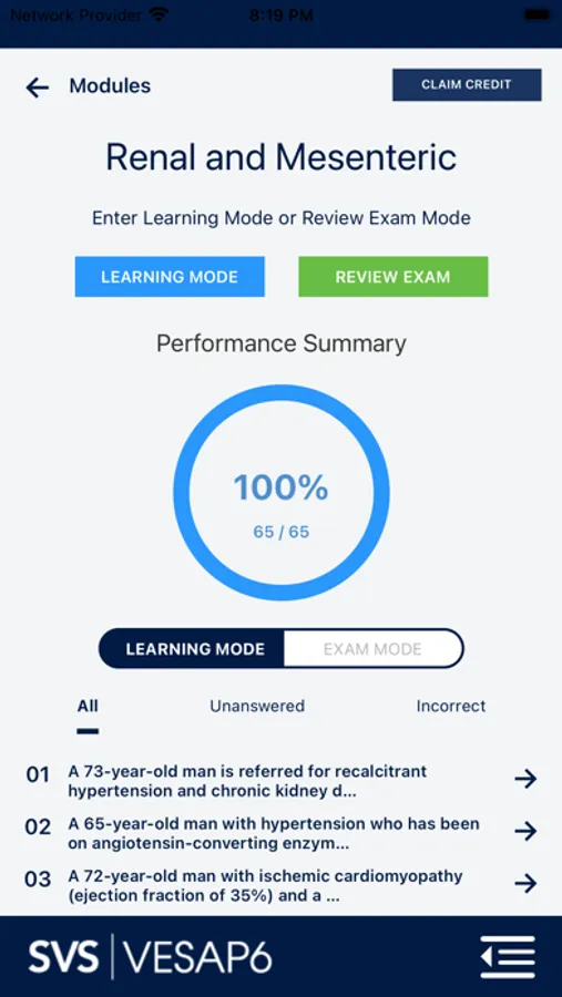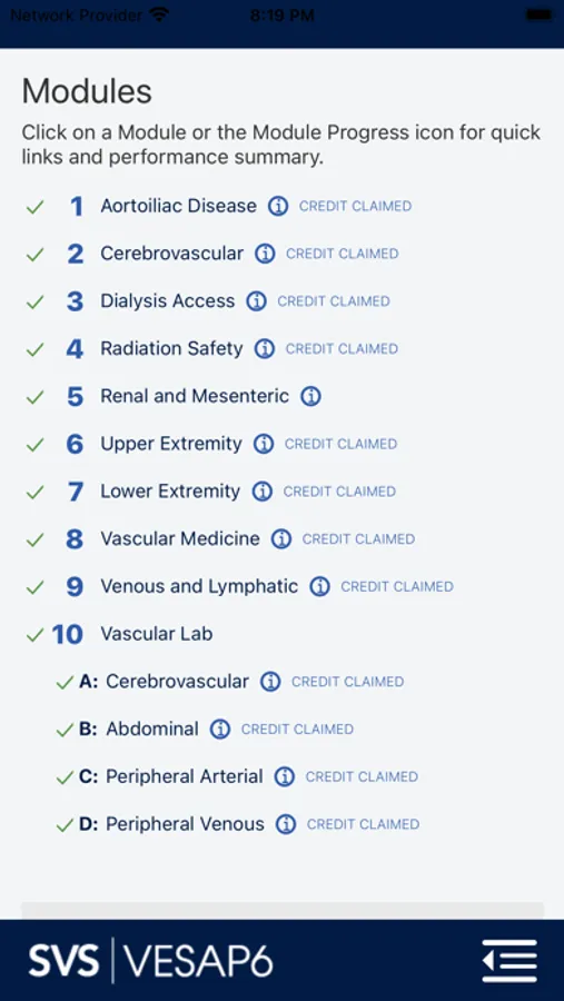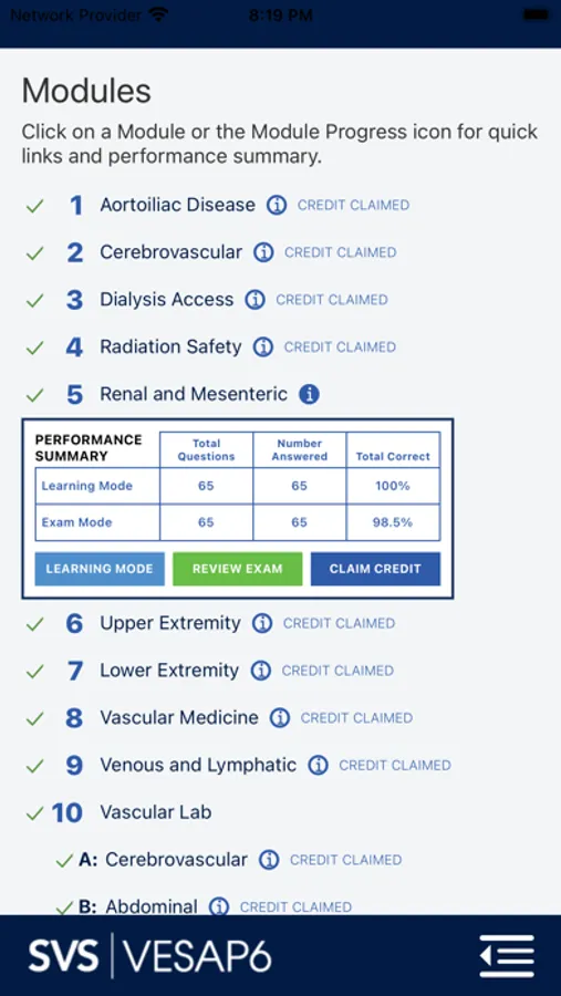 The sixth edition of the Vascular Education and Self-Assessment Program (VESAP6) is an online self-assessment education program for vascular surgeons, designed to meet the Maintenance of Certification requirements of the Vascular Surgery Board of the American Board of Surgery for continuing medical education credits and MOC self-assessment credits.
