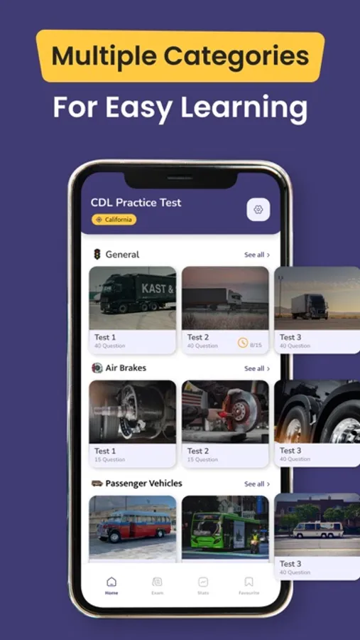 This app includes CDL practice test (CDL study guide) for various categories:
