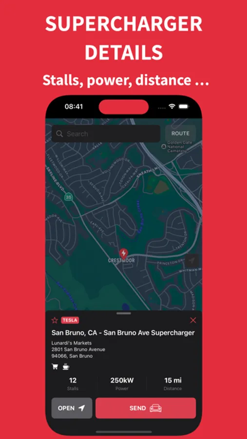 • Supercharger Details: Get comprehensive information on each charger, including address, available amenities (restaurants, restrooms, WiFi), number of stalls, charger power, and distance from your current location.