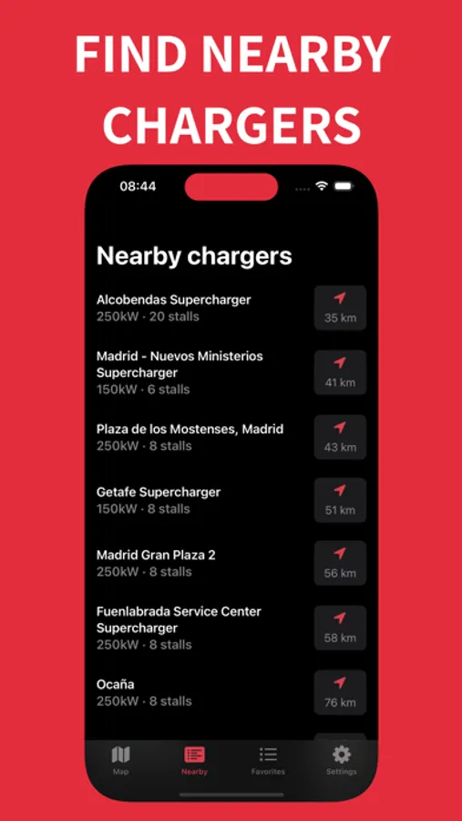 • List of Nearest Chargers: See a list of the closest chargers sorted by distance.