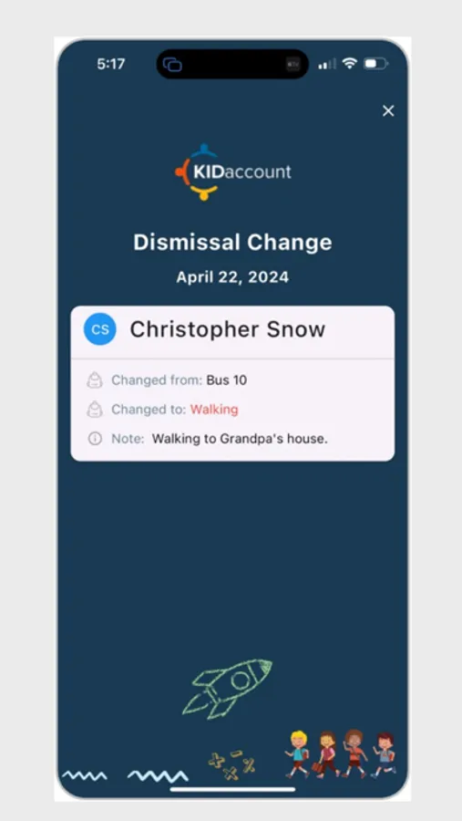 Real-Time Notifications: Receive confirmation alerts about any changes to your child’s dismissal schedule directly on your phone, ensuring you are always informed.