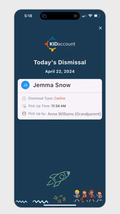Daily Pickup Updates: Get detailed daily notifications about who picked up your child, by whom and by which method—carline, bus, walking home, or after-school programs.