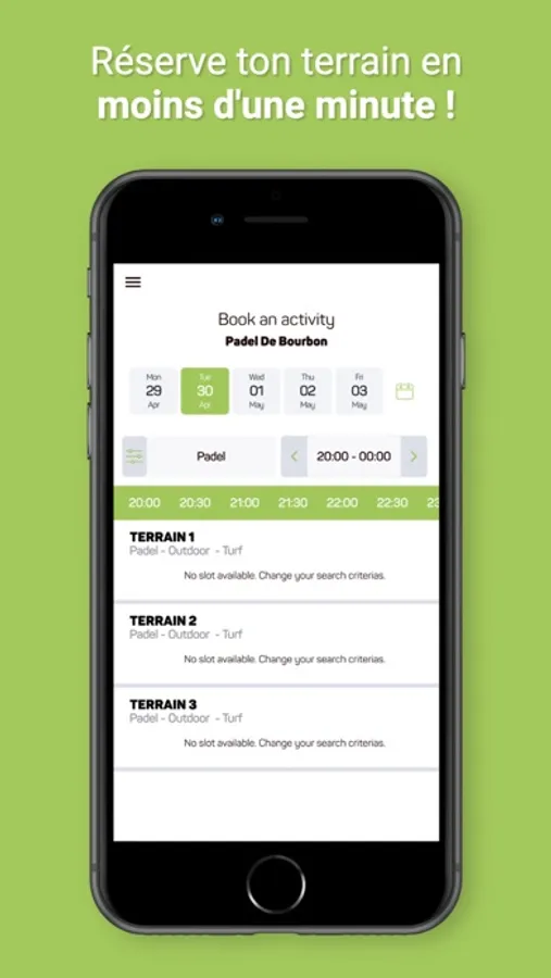 Fini la corvée de réservation ! Avec l'application tu n'as plus qu'à accéder aux créneaux disponibles et à en choisir un. Le club recevra alors automatiquement ta réservation.