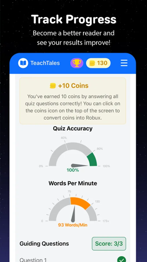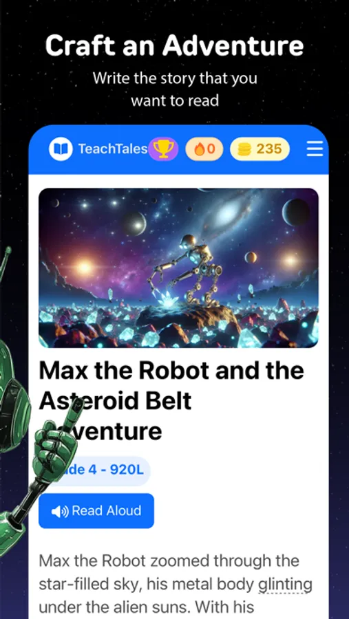 Behind the scenes, our sophisticated AI algorithms craft stories and questions that align with educational standards while keeping the content fresh and exciting. Parents can easily track their child's reading progress and celebrate their growing skills.