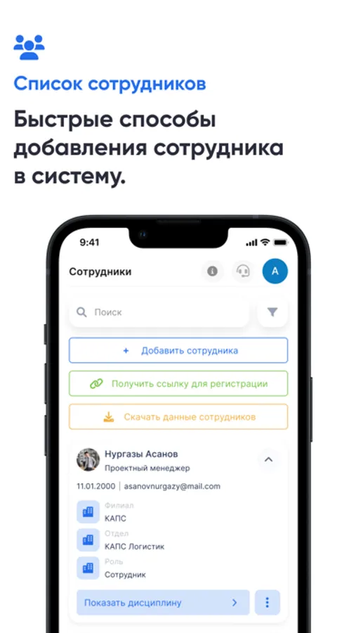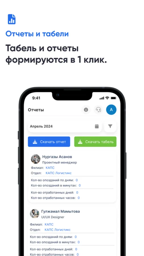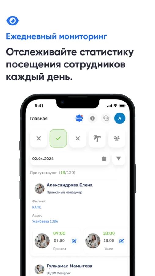 • Просматривать статистику посещения сотрудников в онлайн режиме