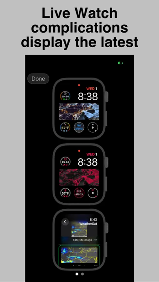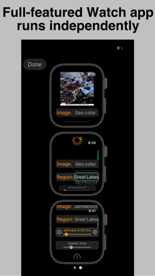WeatherSat lets you easily view NOAA's weather satellite imagery covering half the globe. Make the weather come alive using the app's animation feature that shows weather changes over the course of a day. Explore different visualizations such as lightening and wind, and enjoy watching the ever-changing flow of weather systems. WeatherSat can run completely standalone on your Watch, and supports iPhone widgets, lock screen widgets, and Watch complications. If you're interested in weather, WeatherSat will let you see it unfold in a whole new way.