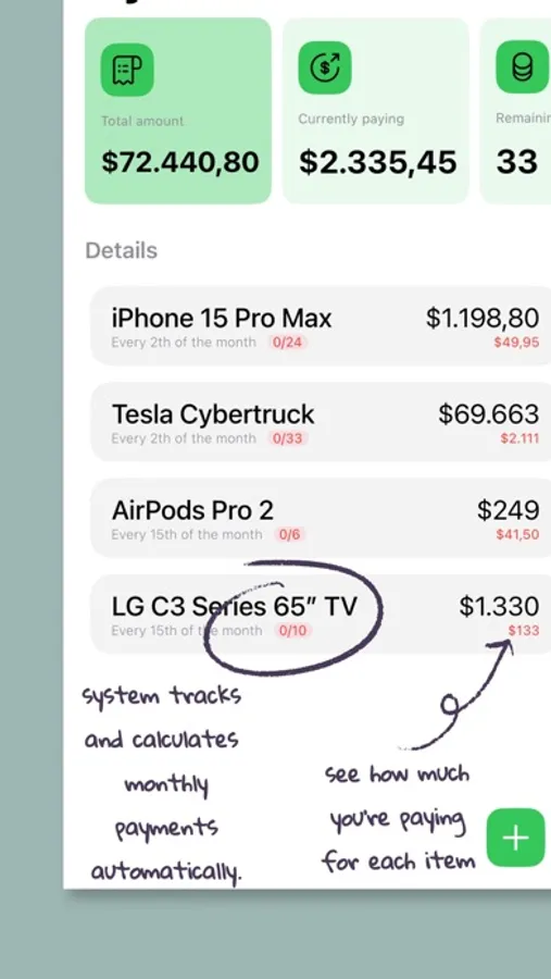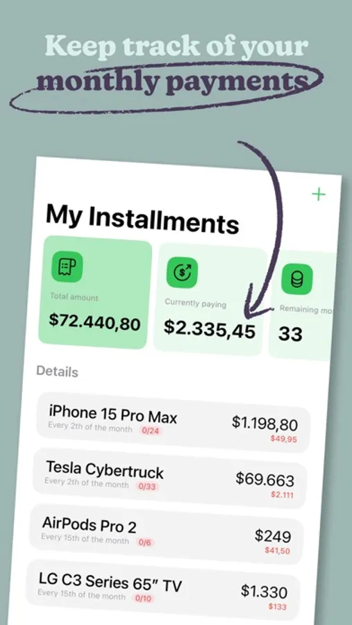 Create, track, and manage all your installment payments with ease. Our intuitive interface lets you stay organized effortlessly, so you can focus on what matters most.