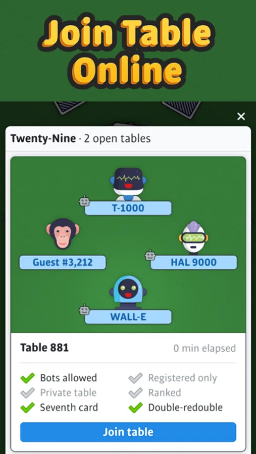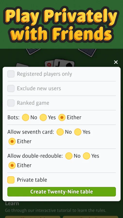 Meeting fellow card game enthusiasts online is nice, but nothing beats a game against friends or family. Start a private table and let your friends know about the table name to get them to join.