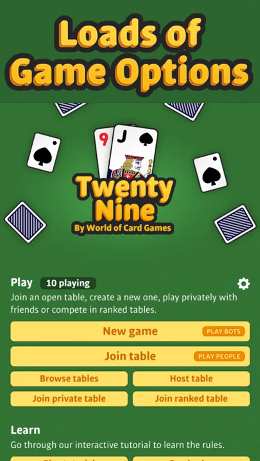 Play Twenty Nine to your heart's content with the official Twenty Nine card game app from World of Card Games. Pair up with people by joining one of our tables, play by yourself against our bots, or create a private table and invite your friends and family to play. Our game is free to play and no signup is required.