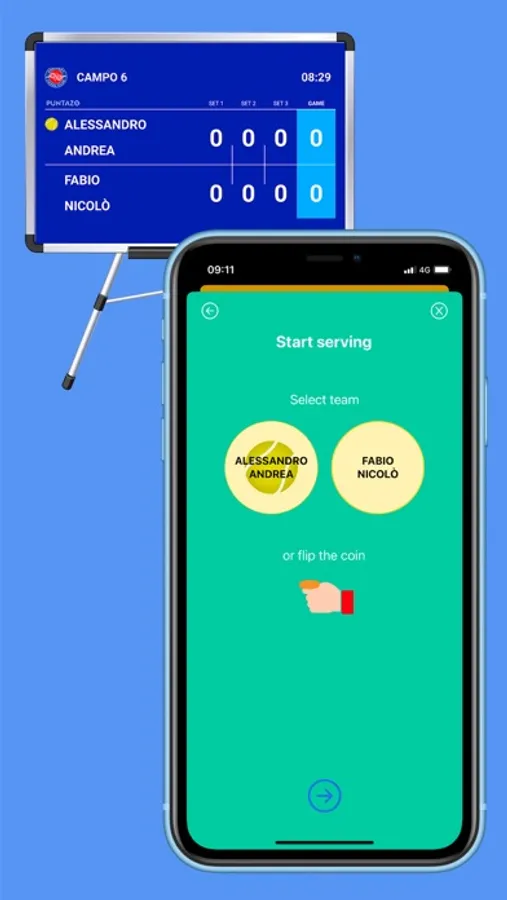 - who starts to serve (or flip the coin)