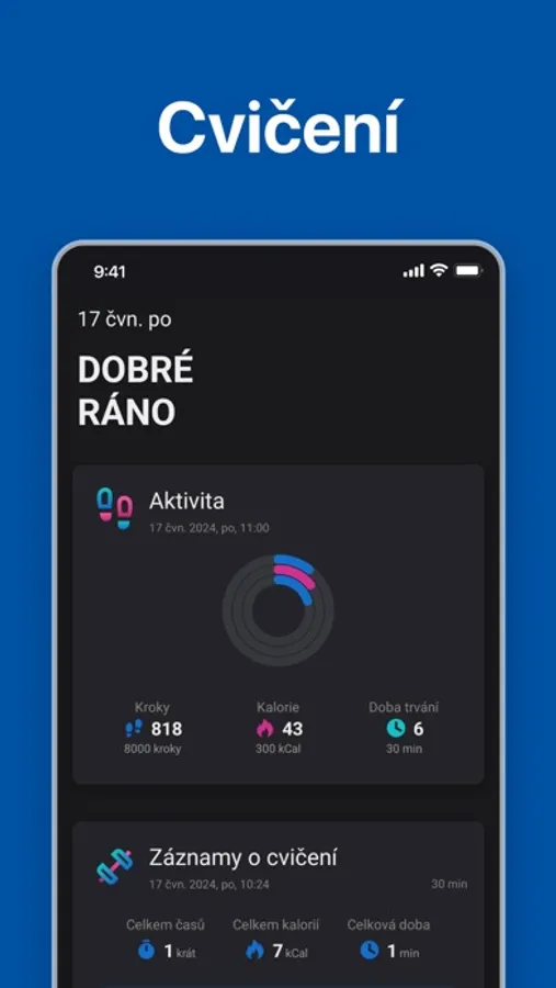 Aplikace podporuje více sportů: Indoor, outdoor, atd. Noste prsten na cvičení a můžete si prohlížet a zaznamenávat svá sportovní data