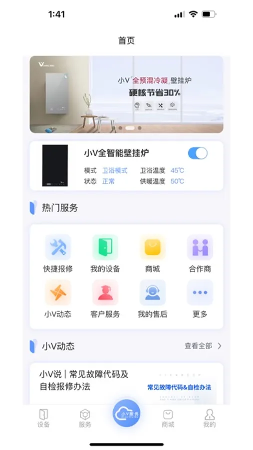 小V服务是一款用于智能控制壁挂炉及日常数据监测的APP软件,主要功能有壁挂炉及温控器配网及控制、智能温度补偿数据展示、实时耗气耗水耗电数据监测、设备故障快捷报修、合作商位置显示、小V动态文章展示、实时客户服务、售后进度查询等功能。