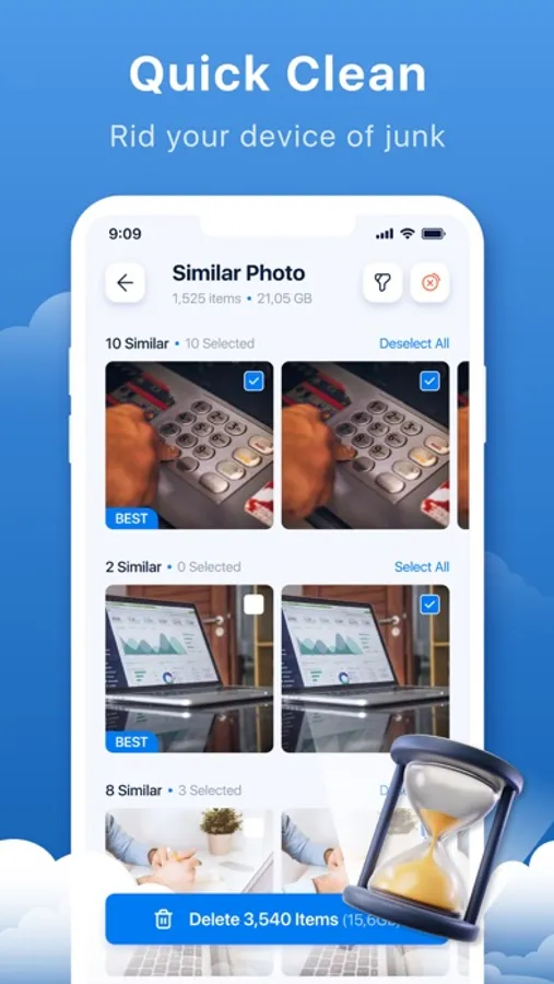 - Duplicate Photos Detection: Identify and delete duplicate or similar photos, including screenshots, burst photos, and live images.
