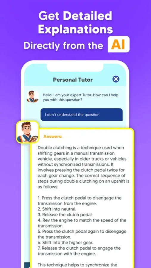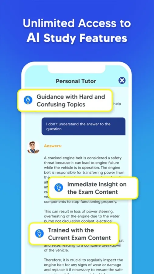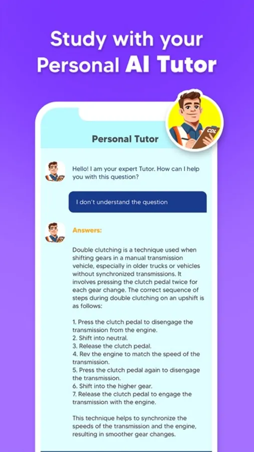 Introducing our cutting-edge AI tutor, designed to enhance your CDL exam preparation journey. With this innovative tool, you'll receive real-time, personalized assistance on the most challenging and perplexing exam topics. Our AI, trained on the latest exam content, integrates seamlessly into the question interface, offering detailed clarifications on both correct and incorrect answers, and providing further guidance to deepen your understanding. Whether you're grappling with complex concepts or seeking to refine your knowledge, our AI companion is here to support you every step of the way, ensuring you're fully prepared to ace your CDL (Commercial Driver's License) exam.