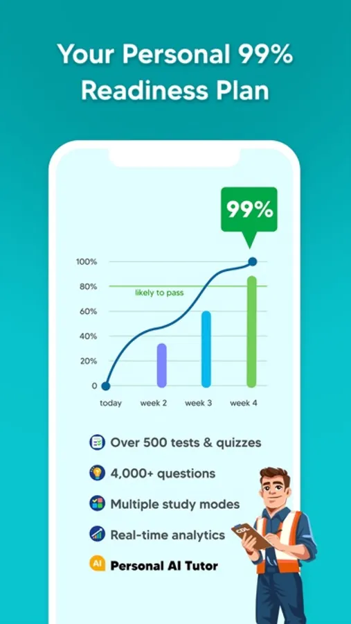 Moreover, our mobile app offers a personalized study plan tailored to your skill level, study frequency, and target test date. Unsure about your exam date? You can modify your study plan as often as needed. Our unique readiness score will guide you in determining when you're ready to take the real exam and achieve a high score on your first attempt.