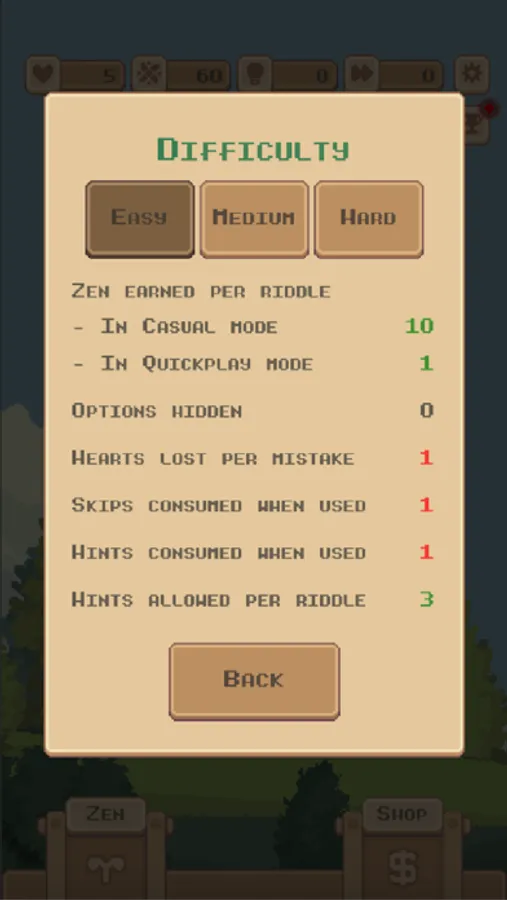 - Each difficulty will affect the way the game is played (Easy, Medium, Hard).