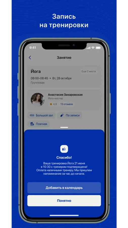 - Получать PUSH-уведомления о предстоящей тренировке за 3 часа;