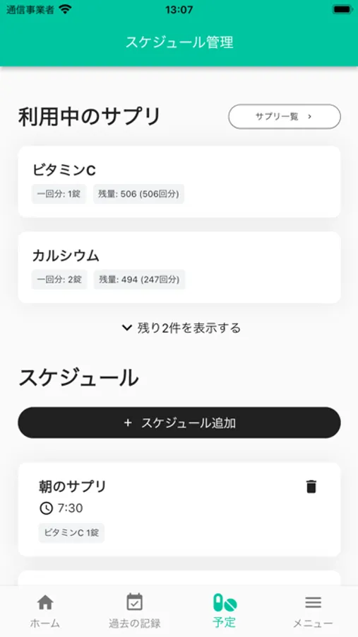 さらに、摂取記録時に自動で残量が更新されるから、サプリメントの買い忘れも防止できて安心です。いつも必要な分が手元にあるから、健康管理がもっとスムーズに。