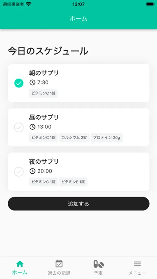 サプメイトは、あなたのサプリメント摂取を楽しくサポートするアプリです。毎日のスケジュール通りにサプリメントを摂取できたかどうかを記録し、うっかり忘れを防ぎます。